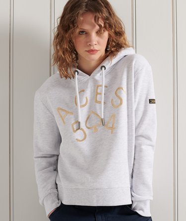 Dieses kurz geschnittene Hoodie bringt Abwechslung in deine Grundgarderobe. Es präsentiert sich mit Kapuze mit Kordelzug, aufgestickter Grafik sowie gerippten Abschlüssen an Ärmeln und Saum.