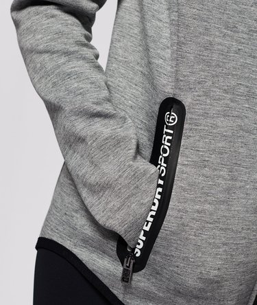 Superdry SD Sport Gym Tech Kapuzenjacke für Damen. Diese leichte, sportliche Kapuzenjacke verfügt über eine Kapuze mit Kordelzug, zwei Reißverschlusstaschen mit dem Superdry Sport Logo und elastische Abschlüsse an Bündchen und Saum. Ein gummierter Superdry Sport Logoaufnäher auf einem Ärmel rundet das Design ab.