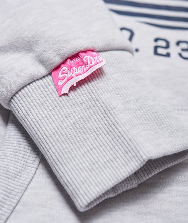 Superdry Track & Field Hoodie für Damen. Ein Hoodie zum Überziehen mit verstellbarem Tunnelzug an der Kapuze, einem rissigen Track & Field Logo und einer Kängurutasche auf der Vorderseite. Die Ärmel sind mit einem rissigen Streifenmuster verziert. Bündchen und Saum sind gerippt. Ein Logoetikett am Bündchen rundet das Design ab.