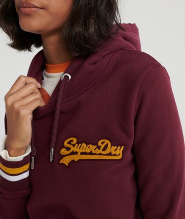 Superdry Vintage Logo Hoodie mit Kettenstich-Aufnäher für Damen. Dieses klassische Hoodie zum Überziehen zeichnet sich durch eine Kapuze mit Kordelzug und Superdry Stickerei sowie ein Rippmuster an Bündchen und Saum mit Streifendetails aus. Eine Kängurutasche und eine Superdry Logostickerei auf der Brust runden das Design ab. Trage dazu Jeans und Sneaker für einen lässigen Auftritt.