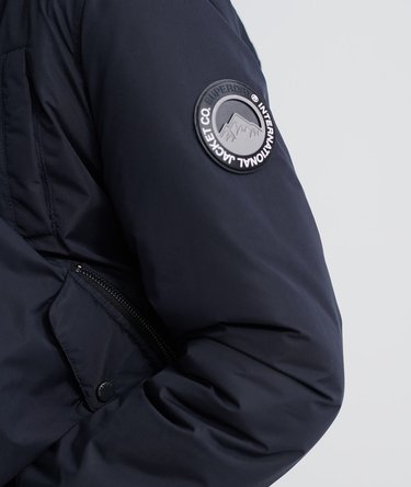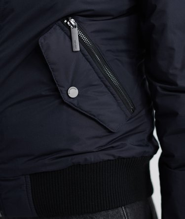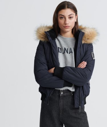 Superdry Bomberjacke aus Mikrofaser für Damen. Diese klassische Bomberjacke ist teilweise mit Fleece gefüttert und verfügt über einen abnehmbaren Kunstfellbesatz an der Kapuze, einen Reißverschluss, vier Fronttaschen und gerippte Abschlüsse an Bündchen und Saum. Abgerundet wird diese warme Jacke mit einem Superdry Logoaufnäher auf einem Ärmel.