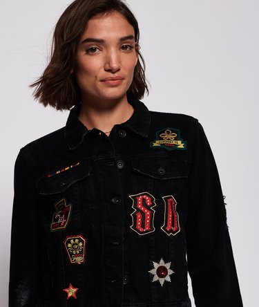 Superdry Girlfriend Jeansjacke für Damen. Diese Jeansjacke im Girlfriend-Stil hat einen Knopfverschluss vorne, vier vorderseitige Taschen und geknöpfte Bündchen. Verstellbare Gurte an den Seiten sorgen für einen figurbetonten Look. Ein dezenter Superdry Logoaufnäher aus Metall auf einer der Taschen vervollständigt das Design.