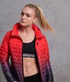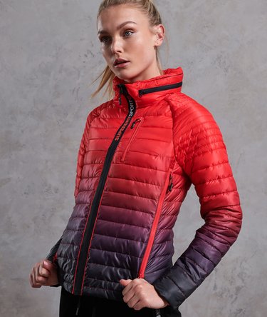 Superdry Power Fade Jacke für Damen. Diese leichte Steppjacke mit verdeckter Kapuze, drei vorderseitigen Reißverschlusstaschen und elastischen Bündchen garantiert einen coolen Look beim Training und hält dich gleichzeitig schön warm. Logos auf den Reißverschlussschiebern und ein Tunnelzug am Saum runden das Design ab.