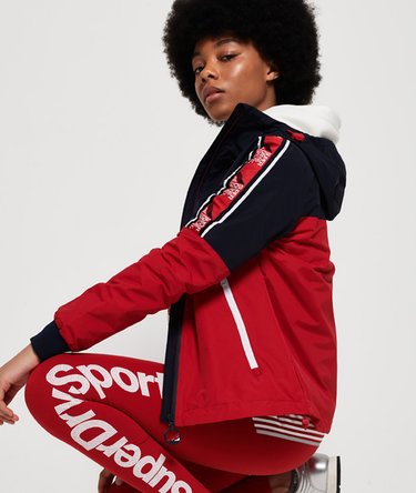 Superdry Sport Chrome Windjacke mit Streifen für Damen. Diese leichte Windjacke präsentiert sich mit einem Frontreißverschluss, einem verstellbaren Kordelzug an der Kapuze und am Saum, zwei vorderseitigen Reißverschlusstaschen und gerippten Bündchen. Hinzu kommen ein Netzfutter, Superdry Logostreifen entlang der Ärmel und ein strukturiertes Superdry Logo im Rücken. Ein gummiertes Superdry Logo auf der Brust rundet das Design ab.