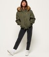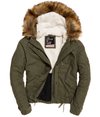 Superdry Toya Rookie Parka für Damen. Die Jacke ist innen halb gesteppt und halb mit Fleece gefüttert. Sie verfügt über einen Reißverschluss mit Druckknopfleiste, einen verstellbaren Saum mit Kordelzug, elastische Ärmelabschlüsse und eine Kapuze mit abnehmbarem Kunstfellbesatz. Ein Superdry Logoaufnäher auf einem Ärmel, ein Superdry Logoetikett auf einer Tasche und aufgedruckte Superdry Logos auf der Knopfleiste und auf der Rückseite vollenden das Design.