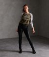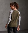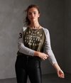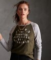 Superdry Code Baseball Oberteil für Damen. Dieses Oberteil mit langen Raglanärmeln hat ein großes Superdry Logo auf der Brust, Superdry Branding auf einem Arm und einen Superdry Logoaufnäher am Saum.
