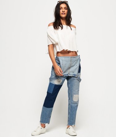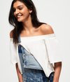 Schulterfreie Superdry Alia Bluse für Damen. Dieses leichte, schulterfreie, kurz geschnittene Oberteil im Blusen-Stil passt in dieser Saison wunderbar in deine Grundgarderobe. Ein dezenter Superdry Logoaufnäher aus Metall in Saumnähe rundet das Design ab.