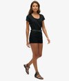 Abgeschnittene Superdry Ruby Shorts für Damen. Diese Denim-Shorts verfügen über einen Reißverschluss mit Knopf am Hosenschlitz, ein klassisches Fünf-Taschen-Design mit Münztasche, Gürtelschlaufen und ungesäumte Hosenbeine. Ein Superdry Logoaufnäher hinten auf dem Bund und logoverzierte Knöpfe runden das Design ab.