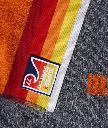 Superdry Sun Rider Handtuch für Herren. Dieses weiche Strandtuch aus Baumwolle hat Streifen an beiden Enden und ein großes Superdry Logo auf der Oberseite.
