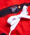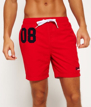 Superdry Premium Water Polo Shorts für Herren. Badeshorts mit appliziertem Print auf einem Bein und einem zweifarbigen, aufgestickten Superdry Logo oberhalb einer Beinöffnung. Die Badeshorts überzeugen mit zwei Fronttaschen und einer Gesäßtasche mit Reißverschluss. Markenschlitze, die charakteristischen orangen Nähte und ein komfortables Netzfutter runden das Design ab.