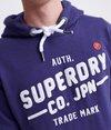 Superdry Japan Classic Hoodie für Herren. Dieses Hoodie aus unserer limitierten Edition zeichnet sich durch ein Rippmuster an Saum und Bündchen, eine Kängurutasche auf der Vorderseite und eine Kapuze mit Kordelzug aus. Ein strukturiertes Superdry Logo auf der Brust, ein Superdry Logoaufnäher am Saum und ein Vintage Label Logoaufnäher an einem Ärmel runden das Design ab.
