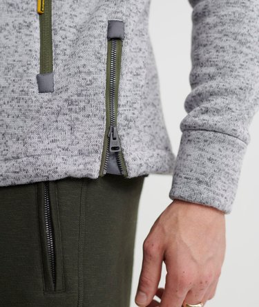 Superdry Storm Hoodie mit halblangem Reißverschluss für Herren. Dieses Hoodie ist perfekt für die Übergangszeit. Es verfügt über eine Kapuze im Hybrid-Stil mit Kordelzug, einen halblangen Hauptreißverschluss und eine Kängurutasche mit zwei Reißverschlüssen. Das Modell hat außerdem einen seitlichen Reißverschluss, einen abgerundeten Saum hinten und Daumenlöcher an den Bündchen. Ein Superdry Logoaufnäher auf einem Ärmel und ein Superdry Logoetikett auf der Kapuze vervollständigen das Design.