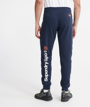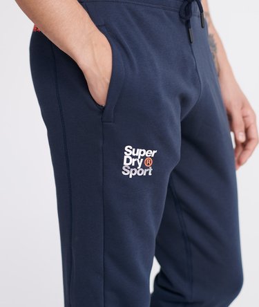 Superdry Core Sport Jogginghose für Herren. Diese bequeme Jogginghose verfügt über einen Elastikbund mit Kordelzug, zwei Reißverschlusstaschen und gerippte Bündchen. Ein kleiner Superdry Sport Logoprint vorne, ein Superdry Print auf der Beinrückseite und japanische Schriftzeichen hinten am Bund runden das Design ab.