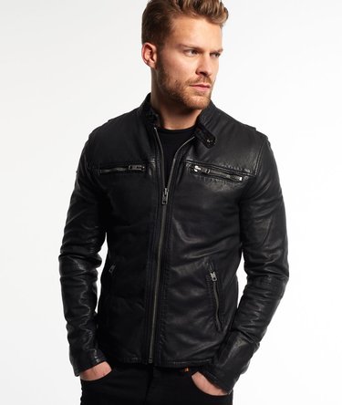 Superdry Real Hero Biker Lederjacke für Herren. Eine kragenlose Bikerjacke aus Leder, mit einem Reißverschluss und vier Reißverschlusstaschen vorn sowie einem Reißverschluss an den Ärmelabschlüssen. Die komplett gefütterte Jacke ist mit einer ledergesäumten Innentasche ausgestattet. Ein Superdry-Logobadge aus Metall am Ärmel vervollständigt das Design der Real Hero Biker.